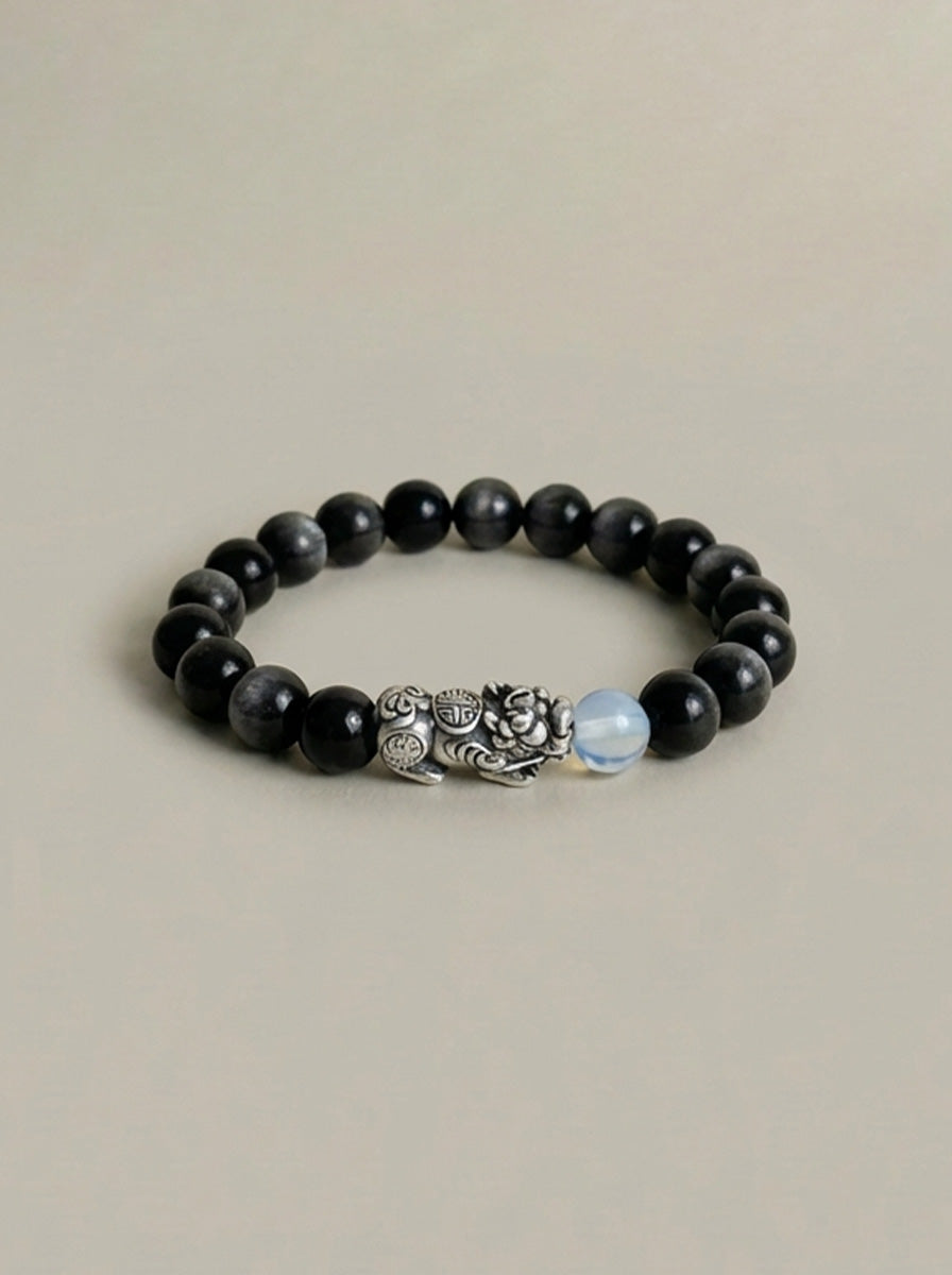 AAA Natural Black Obsidian Pixiu Bracelet · 999 Fine Silver · Moonstone · Feng Shui Wealth Protection Bracelet